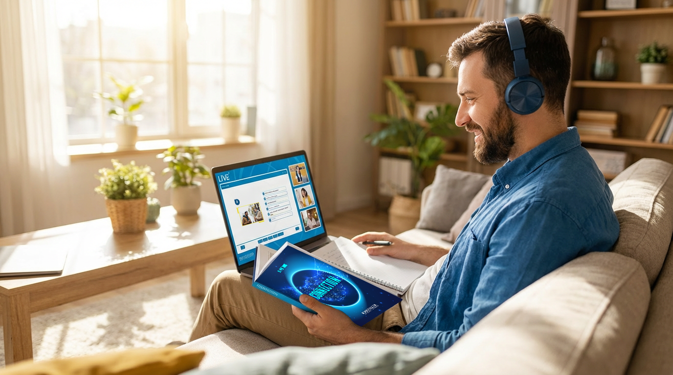 Veja como funciona a dinâmica das aulas ao vivo e o método que acelera sua evolução no idioma.